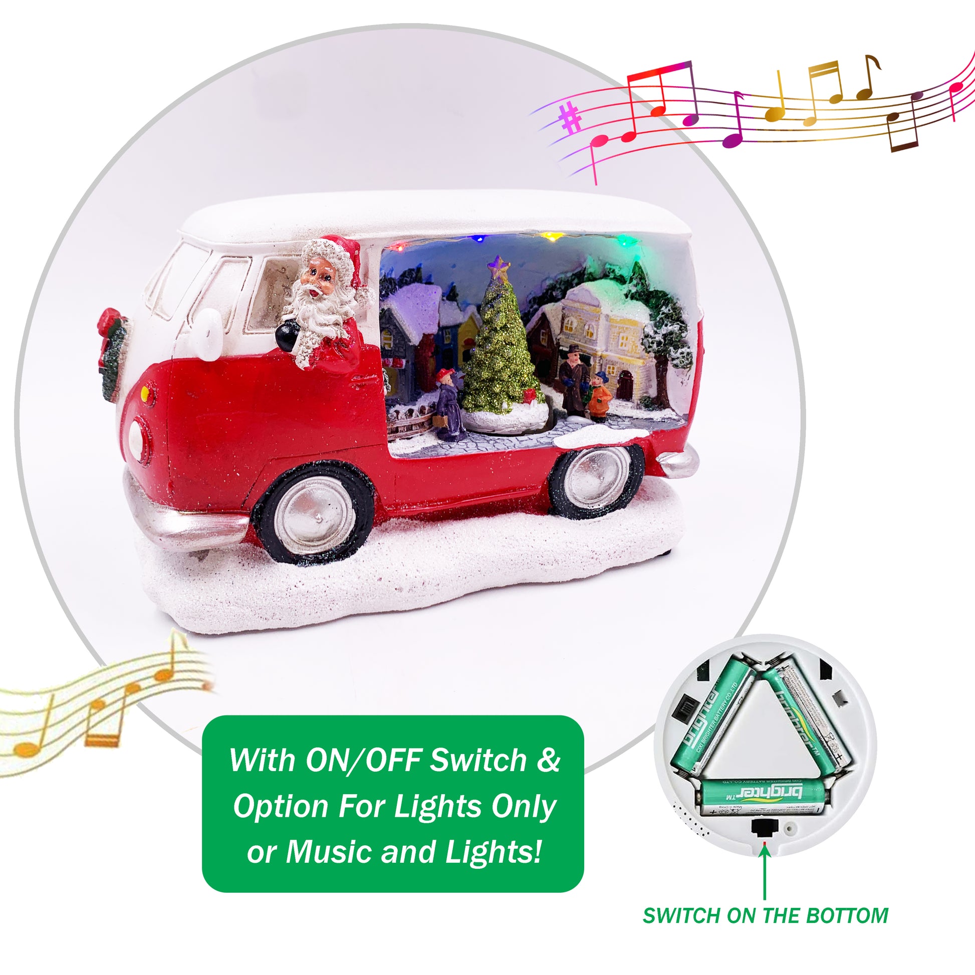 • Battery / Plug In mechanism on base to listen to melodic tune from traditional Christmas song