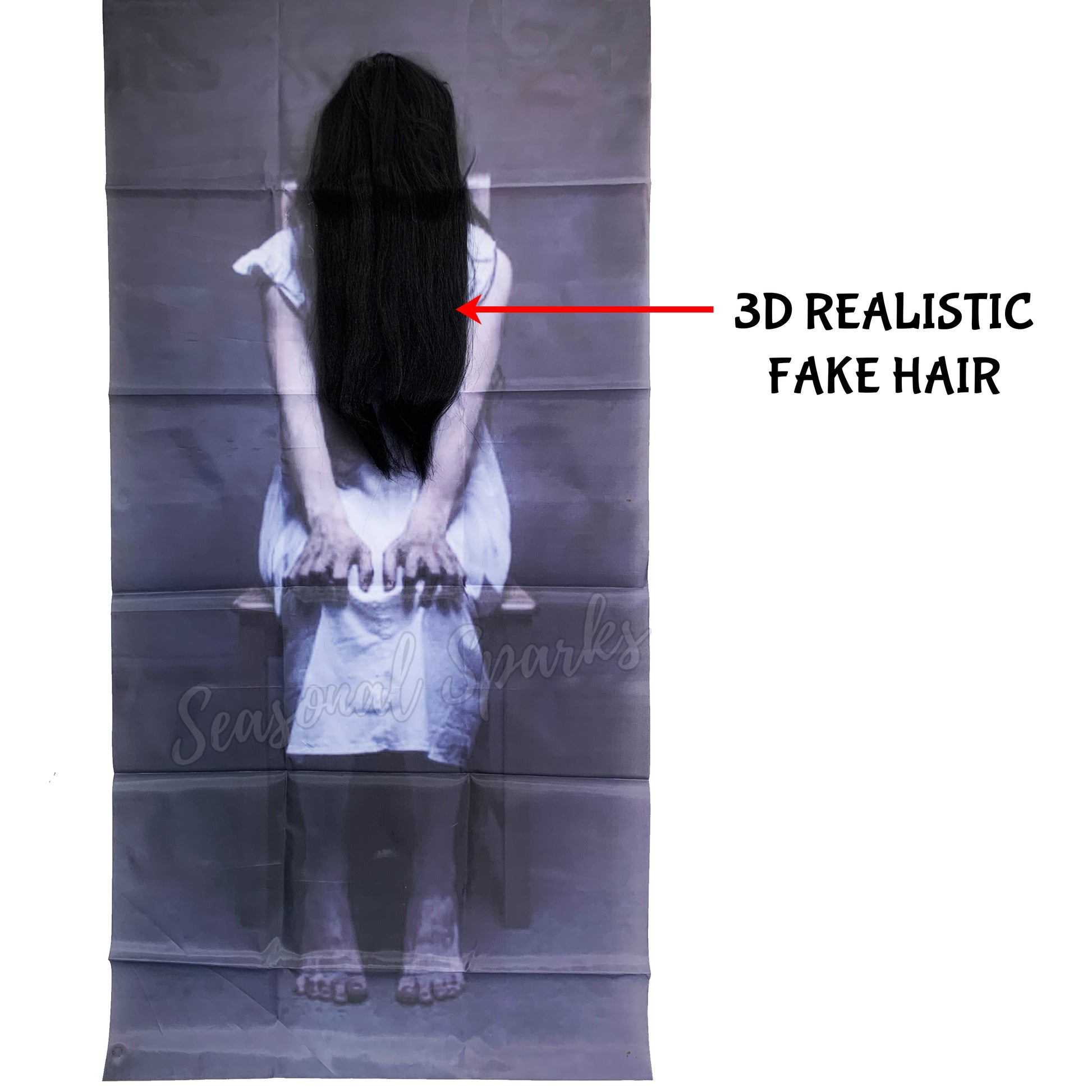 Our Sitting Ghost Girl Decoration is designed with hauntingly realistic imagery. Her long, flowing hair and ethereal presence will make your guests question reality as they cross your threshold.